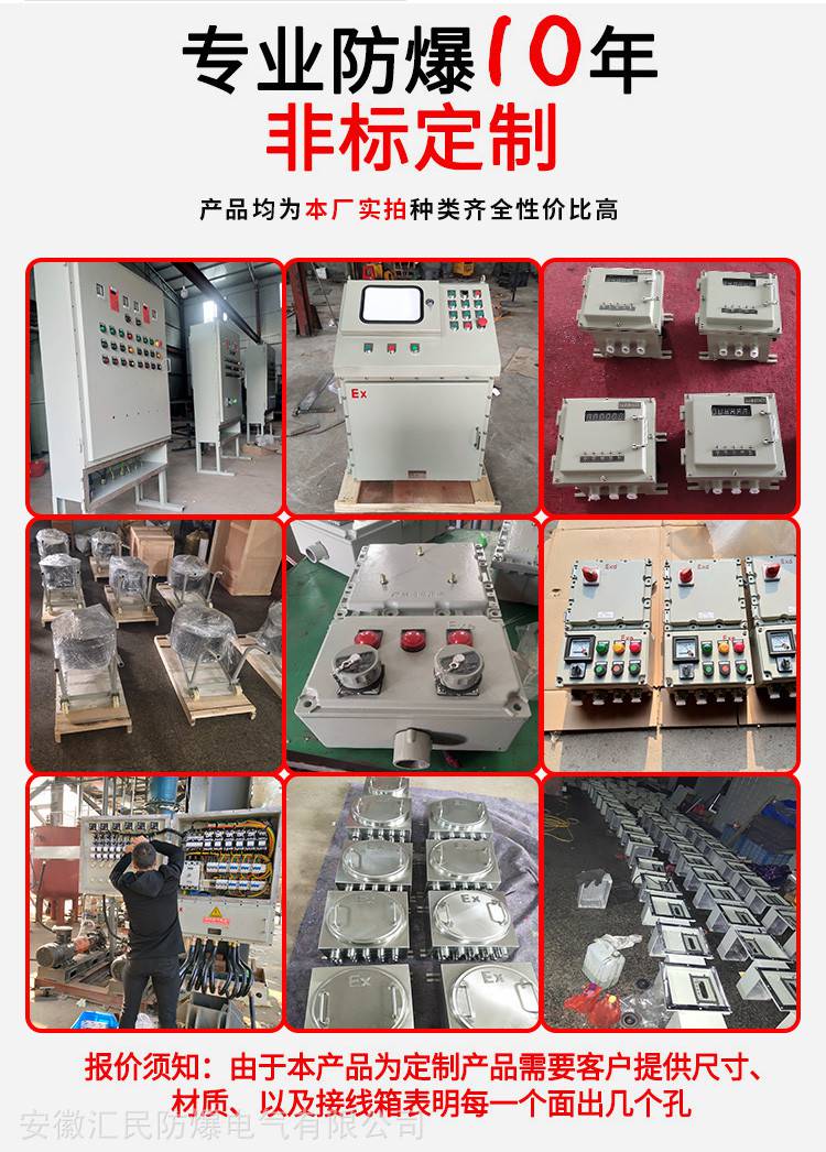 安徽匯民防爆電氣有限公司一直注重人才的培養和質量管理體系的控制,公司擁有充滿活力的工程師團隊和技術熟練的車間工人,采用良好的設備和工藝,壓鑄、噴涂等關鍵工藝都實現了自動化和半自動化,有激光切割機、剪板機、焊接機器人、噴房、數控加工、磨床等設備。同時檢測中心配備了分布光度計、高低溫試驗箱、濕熱試驗箱等一大批檢測設備。樹立“防患于未然,防爆于現場”的安全生產理念,不斷提高研發和質量管理水平。公司有防爆配電箱、防爆接線盒、防爆斷路器、防爆開關等8項產品的3C認證證書和防爆配電箱、防爆燈、防爆正壓柜、防爆空調、防爆風機等14項產品的防爆合格證。